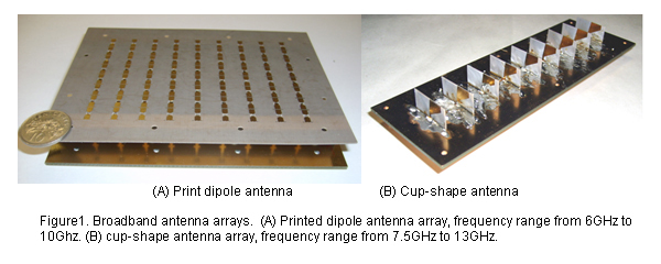 In Figure 1, Antenna A is planar dipole antenna array. The grid size of the array is 21mm×21mm, the thickness of the array is 12.7mm. The antenna’s VSWR is below 2 over 6GHz to 10GHz. The sizes of array’s elements are 10mm in height and 15mm in width (Antenna B). The VSWR is lower than 2 from 7.5GHz to 16GHz.