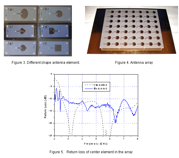 Detailed structure of a novel antenna is presented in Figure 2. The simulated results and measured results shown the antenna is wide bandwidth antenna. When H is around 20mm, R 10mm, the antenna’s VSWR is lower than 2 from 3GHz to 8GHz. Different shape antenna is shown in Figure 3. All these antennas are broadband antennas. The designed antenna array and the measured return loss are presented in Figure 4 and Figure 5. The active radiation patterns of the center elements are acceptable from 3GHz to 7.5GHz.