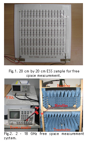 This project aims to develop EM smart screen (ESS) which can be adjusted or modulated by bias current or voltage. For transmission applications, when pin is turn off, the transmission coefficient, T can be 100%; when pin is on, T is adjustable from 0 to 100%. For reflection applications, the reflection coefficient, R can be adjusted from 100 to 0%. Fig. 1 shows the picture of an ESS sample and Fig. 2 shows the free space measurement system used to measure the ESS.