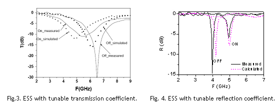 Fig. 4 shows the measured reflection coefficient of a patch ESS. When pin diodes are switched on, the resonance frequency of the patch shifts from 4 GHz to 5 GHz, with the peak amplitude being reduced from 15 dB to about 7 dB. The effective bandwidth of the patch ESS can be more than 20% of the central frequency, meaning that it can be adjusted continuously, which is much wider than that of the metamaterials reported previously. If the thickness (< 0.6 mm) and working frequency band (4 GHz to 5 GHz) are taken into consideration, performance of the patch ESS is much better than any conventional anti-reflection composites.