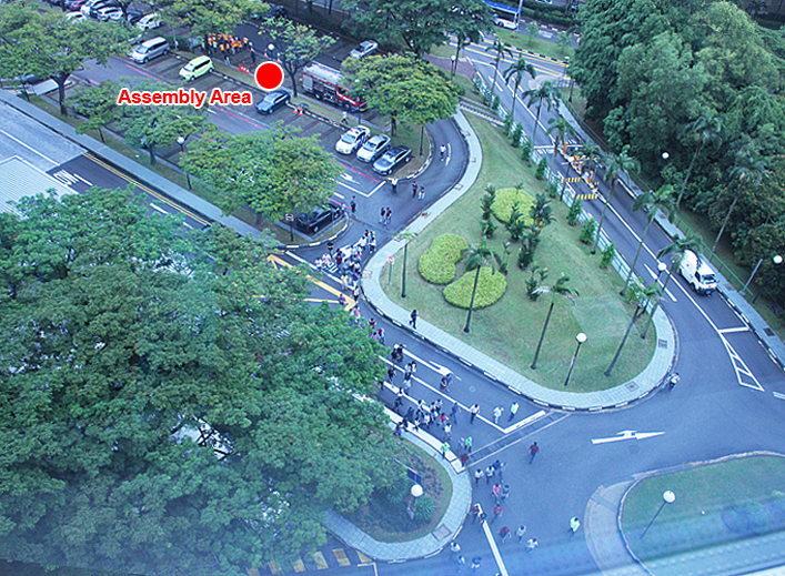When evacuating, do not panic but quickly walk down the staircase by the nearest exit and proceed to the Assembly Area.